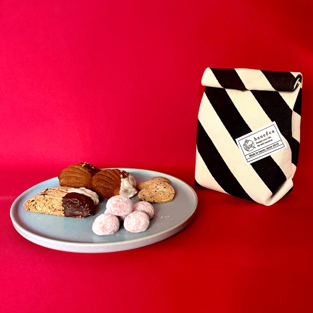今年のバレンタインは、ハネルカのオリジナル・テキスタイルで制作した、ミニ紙袋型ポーチに入ったバレンタインらしい焼き菓子セット。ステッカーをラフに貼ったようなポップなデザインのポーチで、お菓子を食べたあとはバッグインバッグや小物入れとしてお使いいただけます。