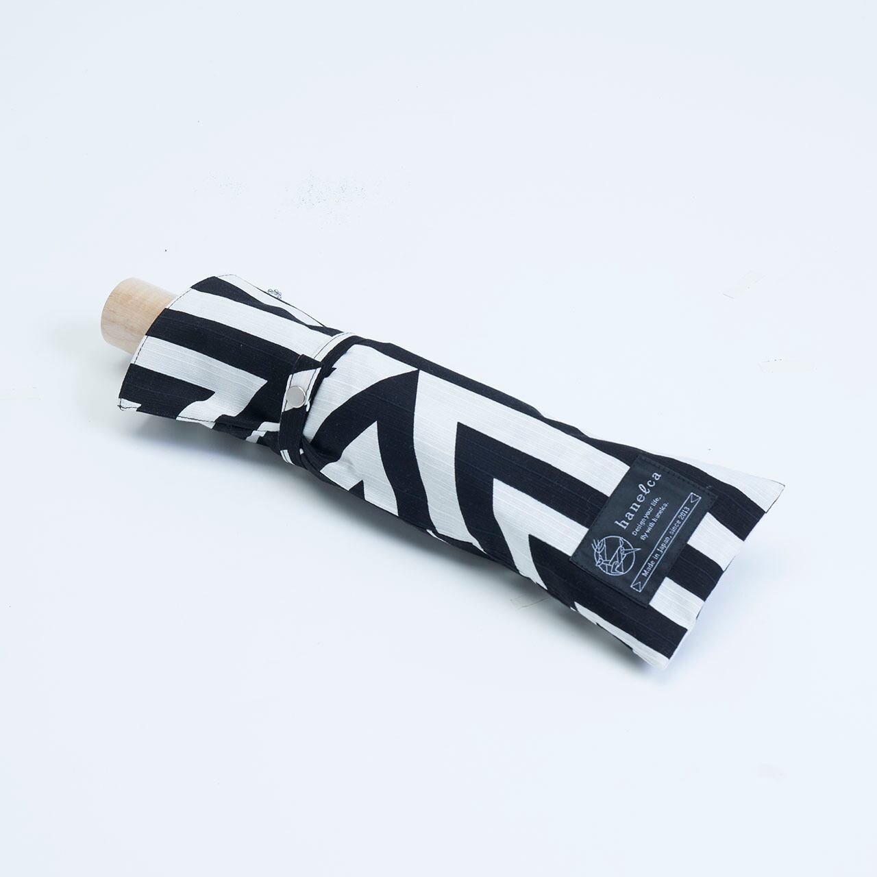 ハネルカのオリジナル風呂敷「万華鏡」の生地を使って仕立てた晴雨兼用日傘。京都で100年以上の伝統を誇る老舗傘工房、小野内商店にて1本ずつ丁寧に手作業で作られています。