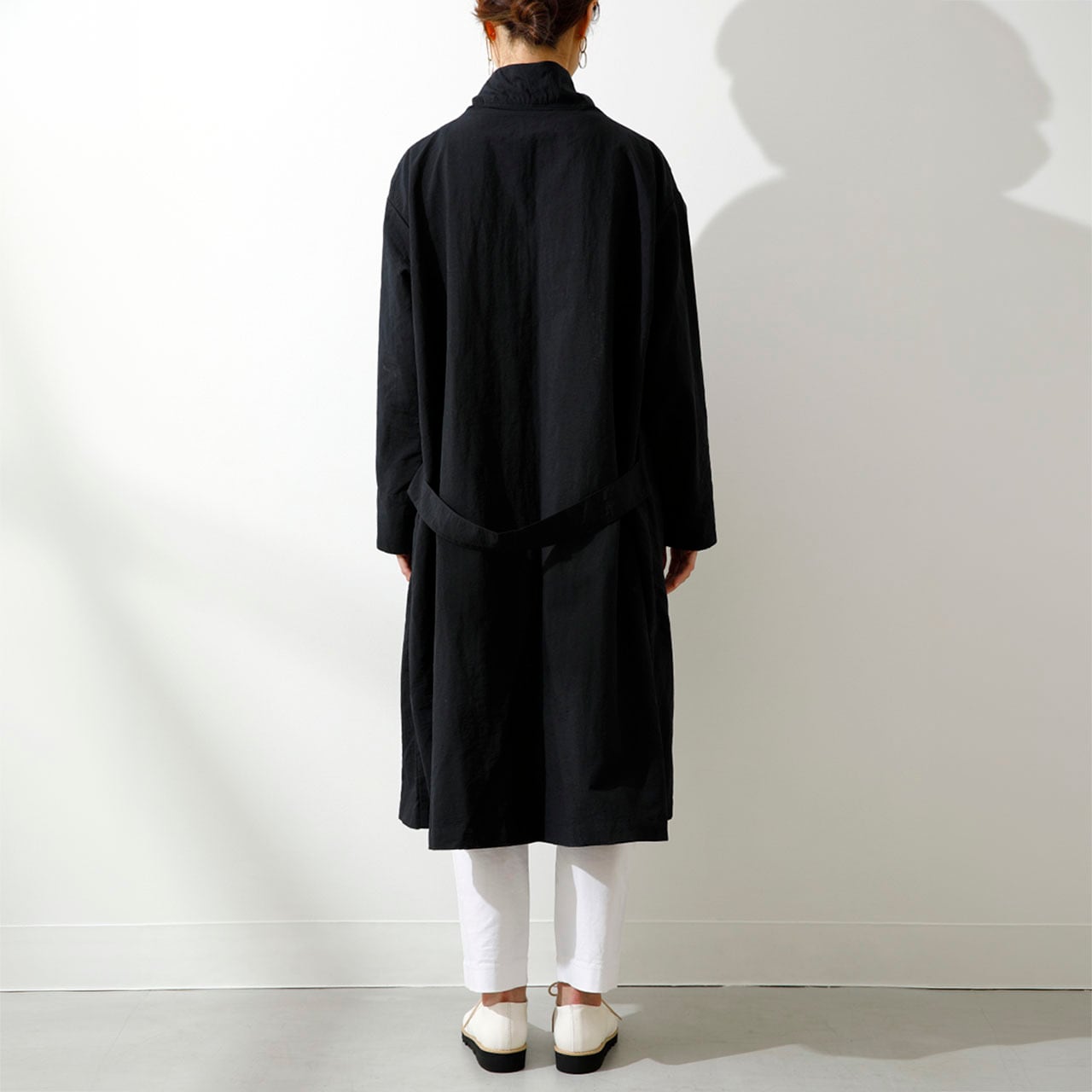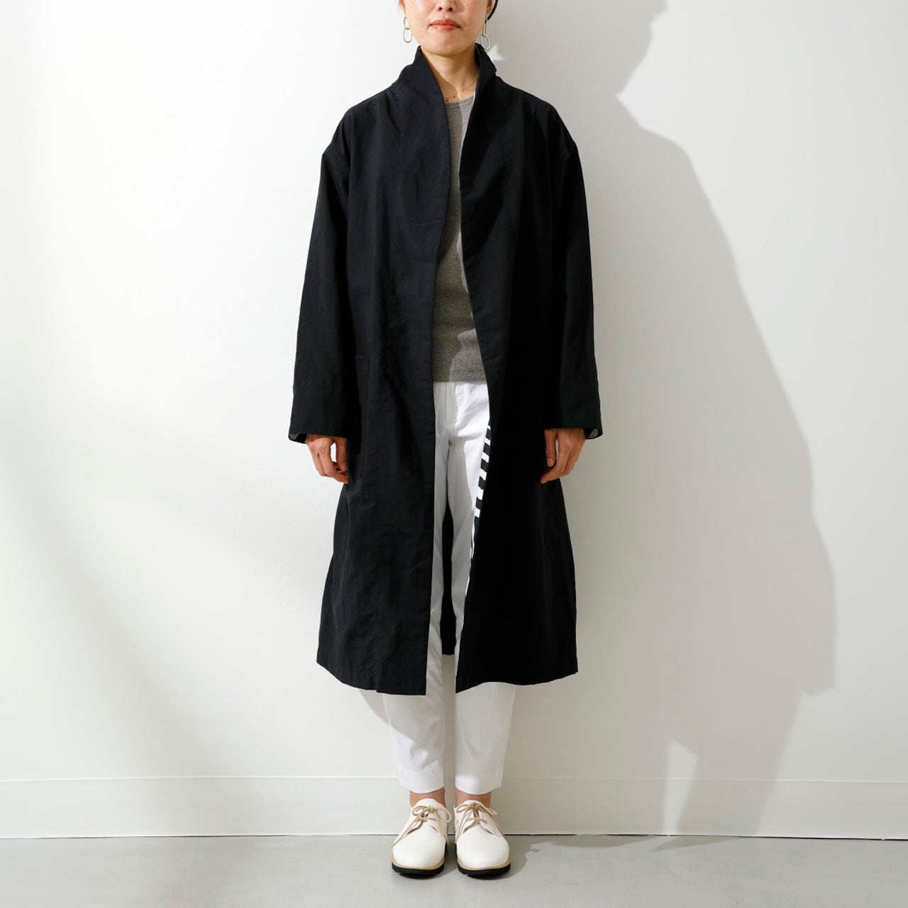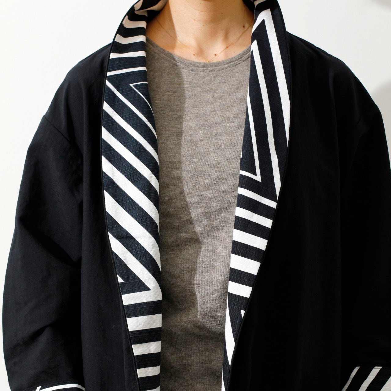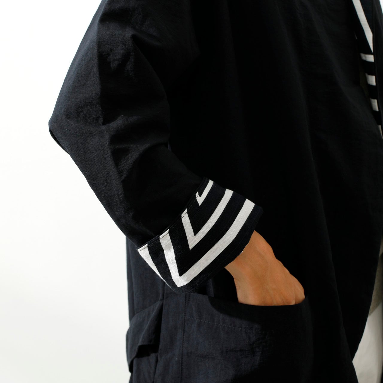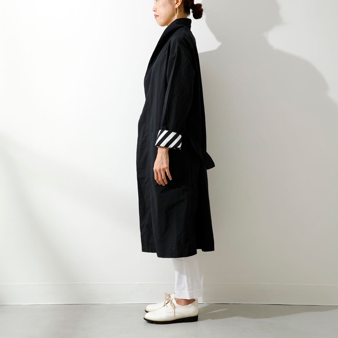 HAORIコートは、着物の羽織をイメージしたショールカラーのロング丈のコート。黒の無地の生地は撥水性のナイロン素材になっているため、レインコートとしてもお召しいただけます。