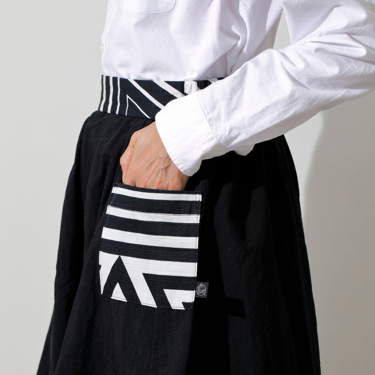 OBIスカートは、ウエスト部分に着物の帯をイメージして、風呂敷の生地をあしらい、シンプルながらも個性が出せるデザイン。ウエストの後ろがゴム仕様になっているため、7号〜11号サイズくらいまでの方に幅広くお召しいただけるサイズ感となっています。