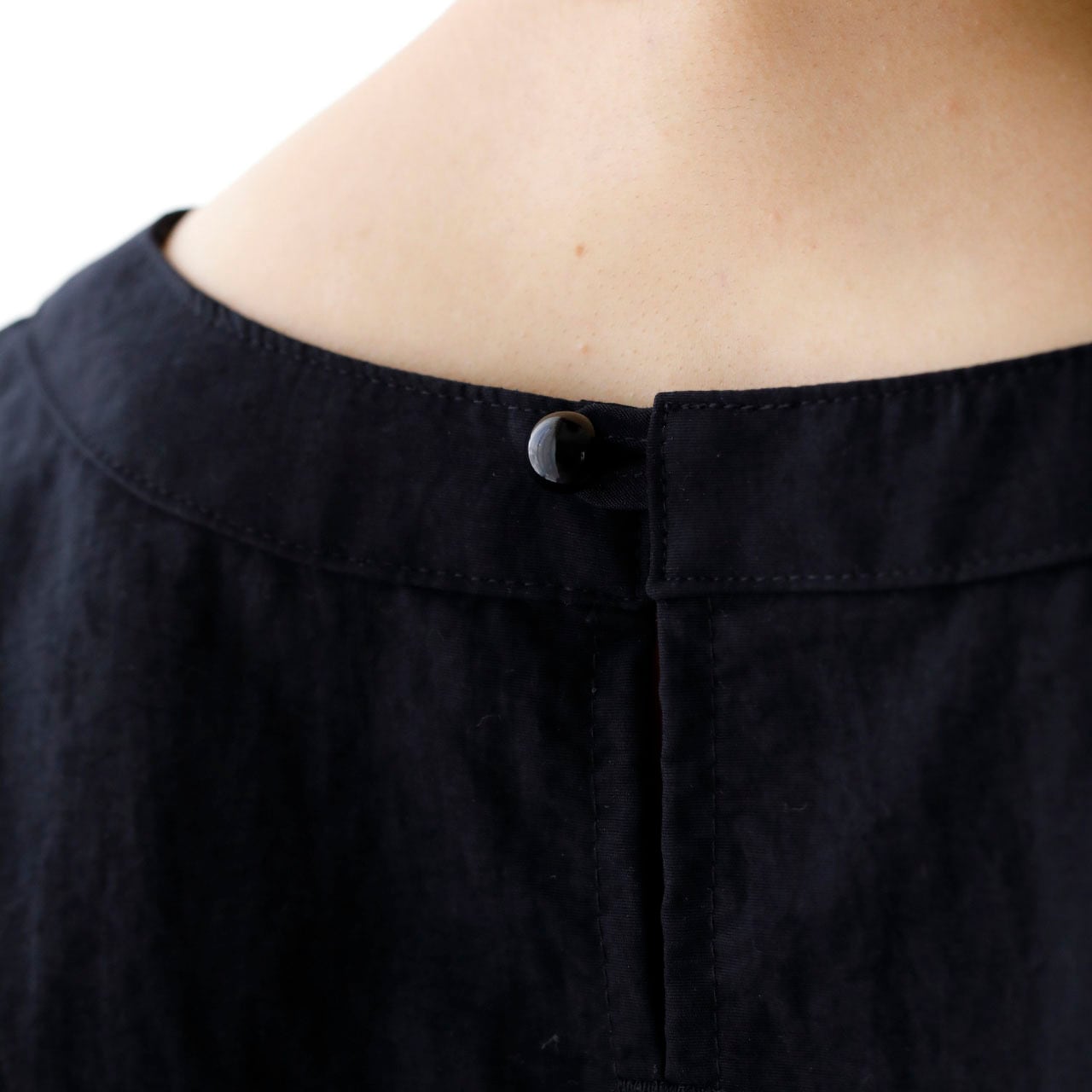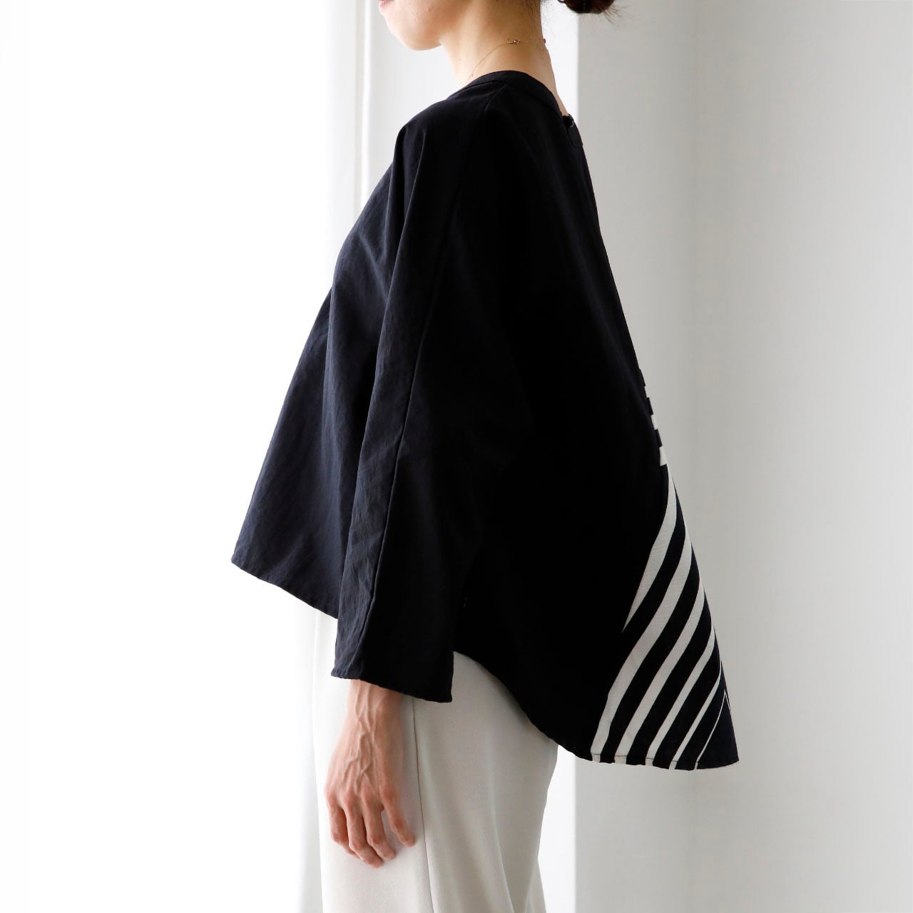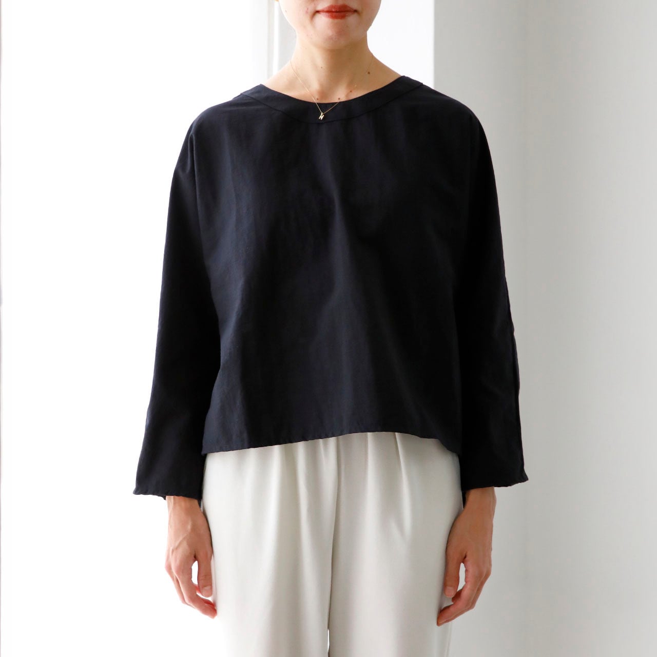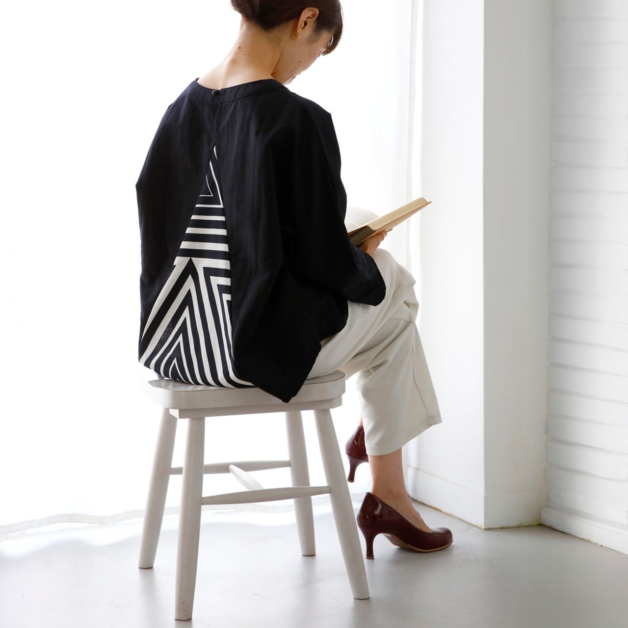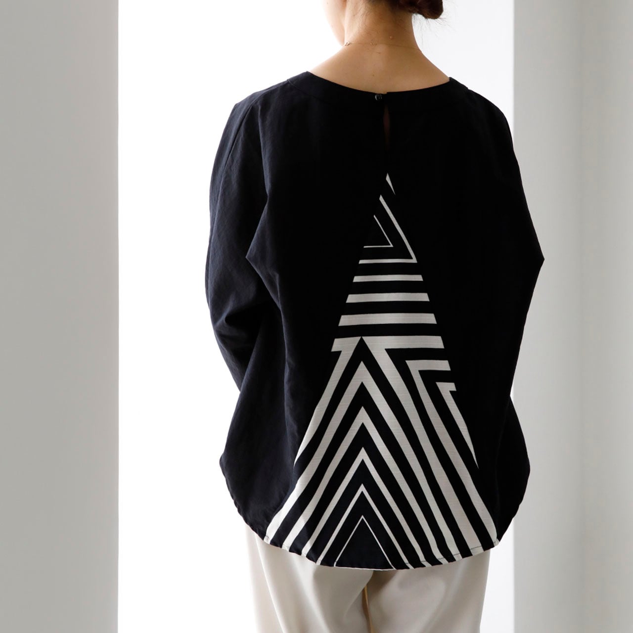 MIKADOブラウスは、背中に三角形(みかど)のカットで風呂敷の生地をあしらったプルオーバータイプのウエア。首の後ろは丸ボタンで留める仕様になっています。