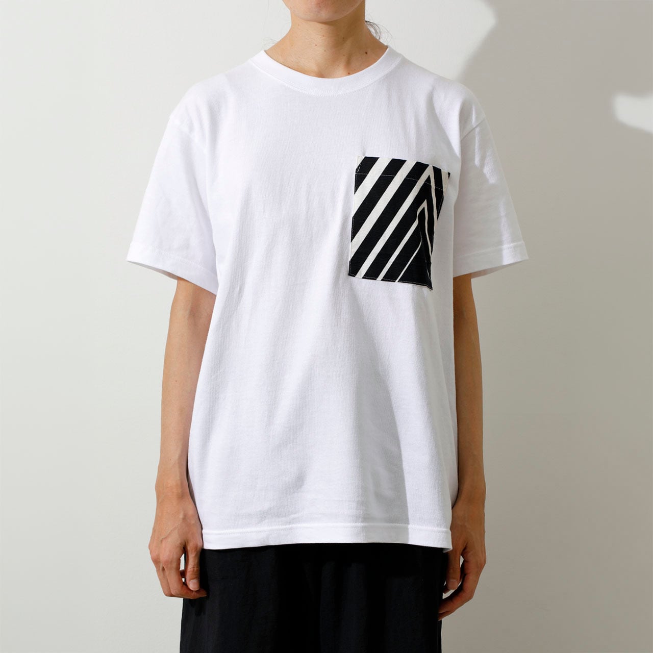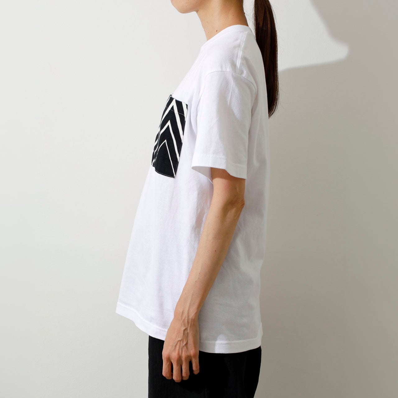 2025年にスタートしたアパレルシリーズ「ハネルカの旅服」。INOUとは衣嚢(ポケット)のこと。シンプルなコットンのTシャツに、ハネルカのオリジナル風呂敷「万華鏡」の生地を使ったポケットをあしらいました。S,M,L,XLの4サイズの展開で、ユニセックスデザイン。色は白と黒。後ろの裾にワンポイントでハネルカのロゴ入りタグが縫い付けられています。