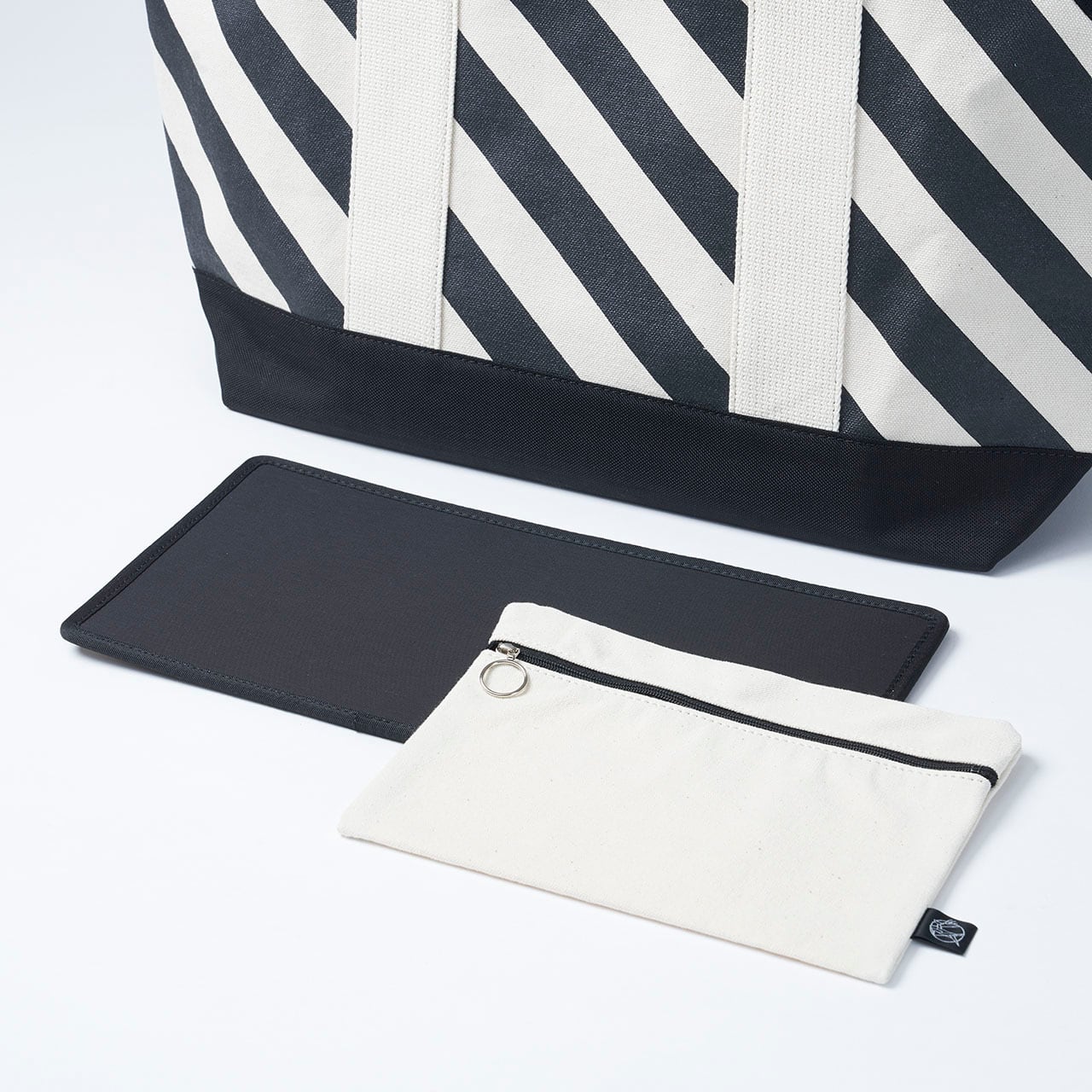 倉敷帆布に京都の手捺染で染色をしたオリジナルのテキスタイルで作ったペットキャリーバッグです。Lサイズは縞柄、Sサイズは水玉柄。底の中敷にはバイオライナーという消臭、抗菌効果高い特殊な生地を使用しています。トップはメッシュ素材のカバーをファスナーで開閉でき、飛び出し防止に首輪とつなぐフックが内部に付いています。バッグの外装の底は撥水加工がかかったナイロン素材を使用していますので、汚れにくいです。また、着脱可能なポーチが内ポケットとしてついているので、動物病院に行く際に診察券を入れたり旅行の際にマナーベルト等を入れたりして使うことができます。