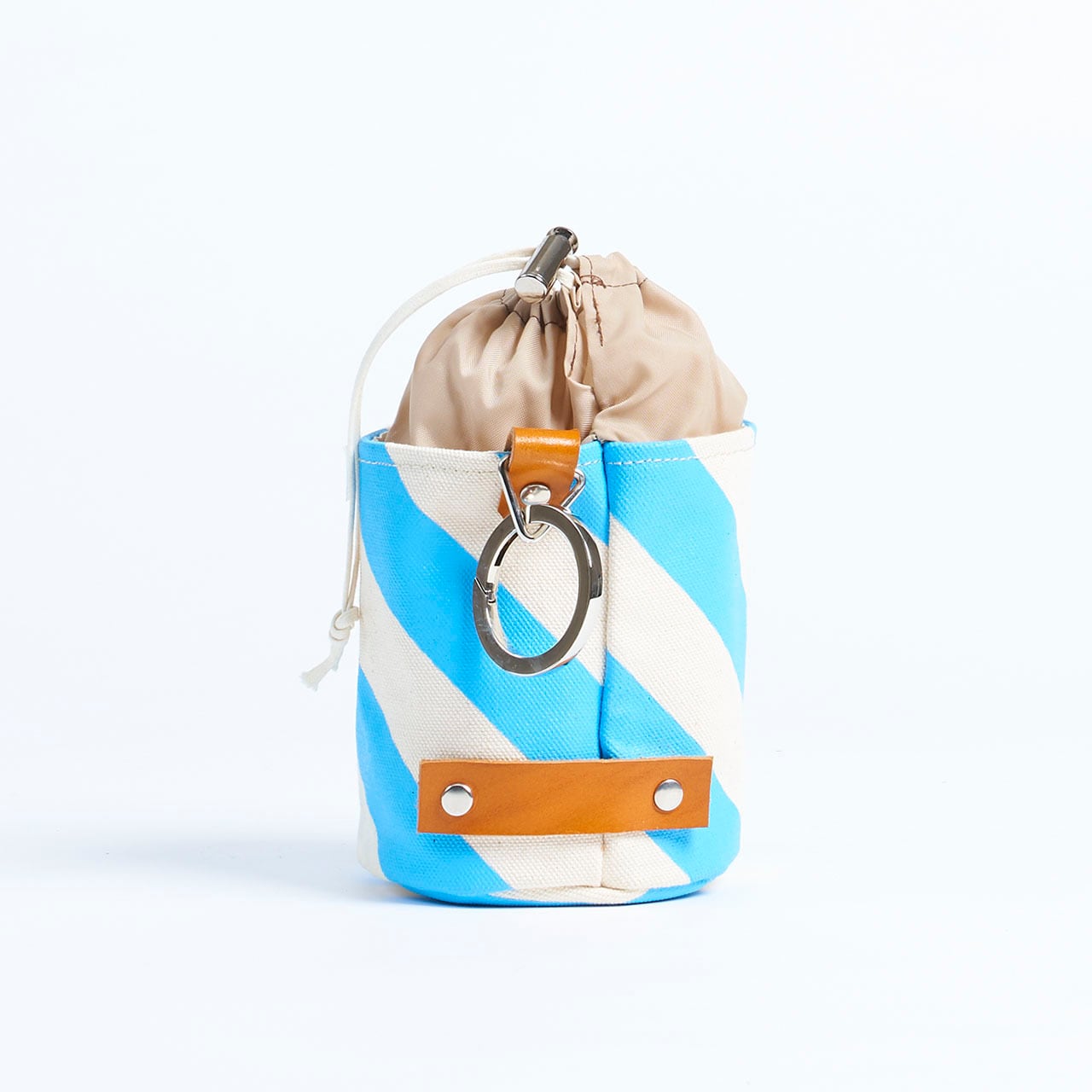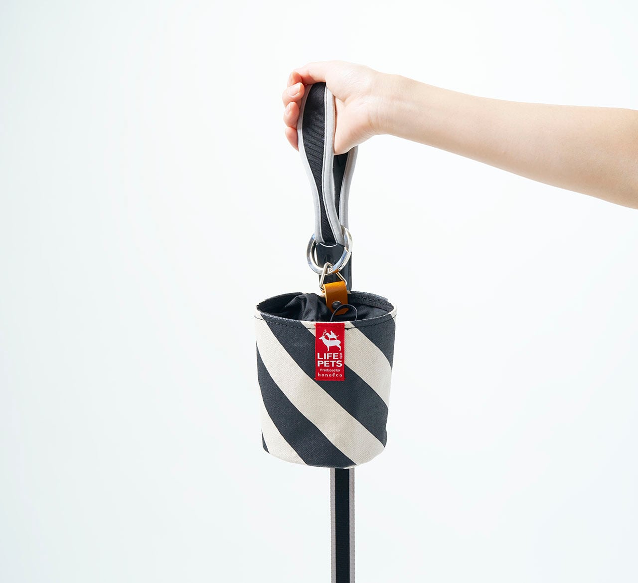 ワンちゃんのお散歩の時にお使いいただくマナーポーチです。上部の巾着部分にはバイオライナーという消臭・抗菌効果の高い生地を使っています。リングカラビナをバッグやベルトループに取り付けたり、リードの持ち手にぶら下げることができ、リードに取り付ける際には、ボタンで取り外せる革ベルトにリードを通すとブラブラせず安定して持ちやすくなります。