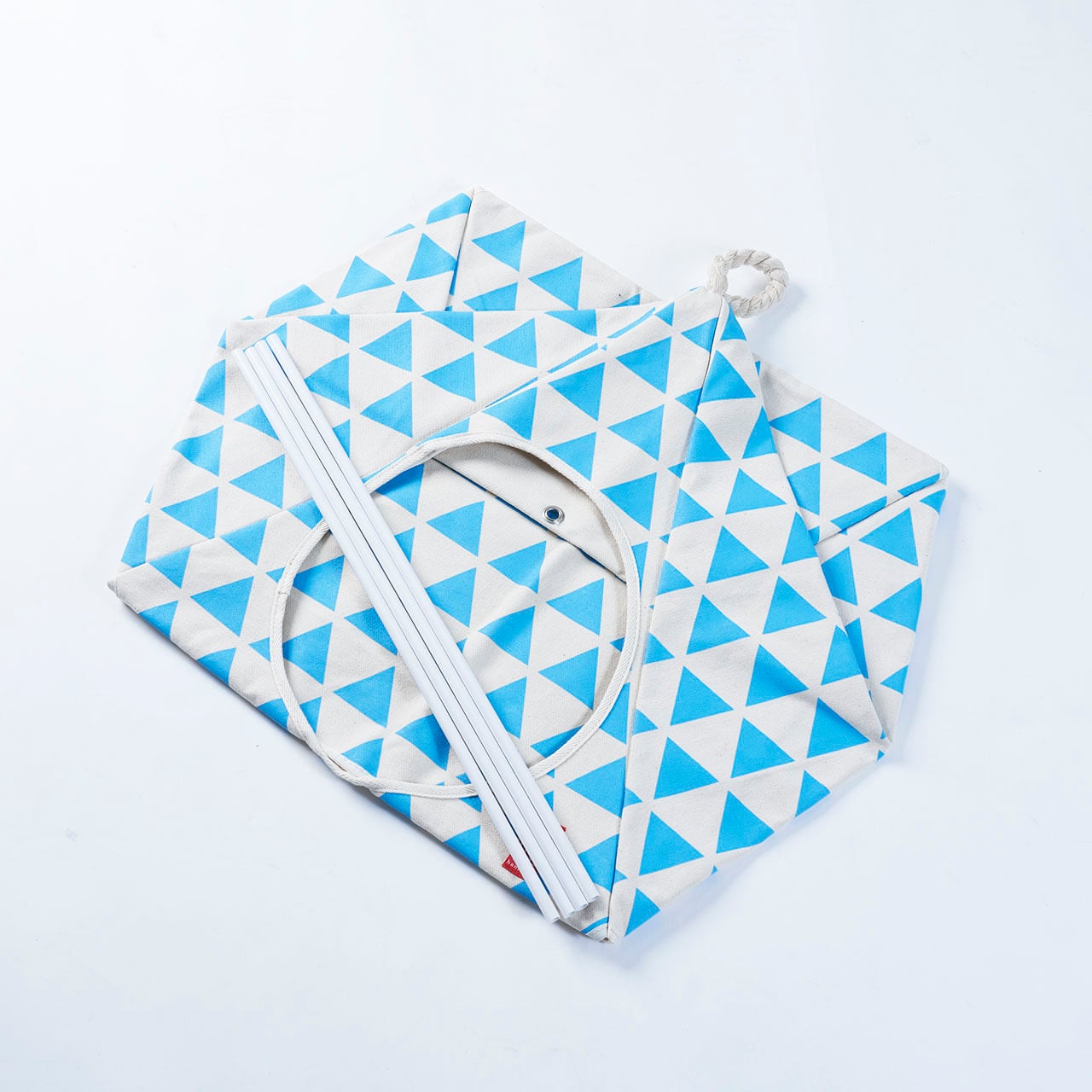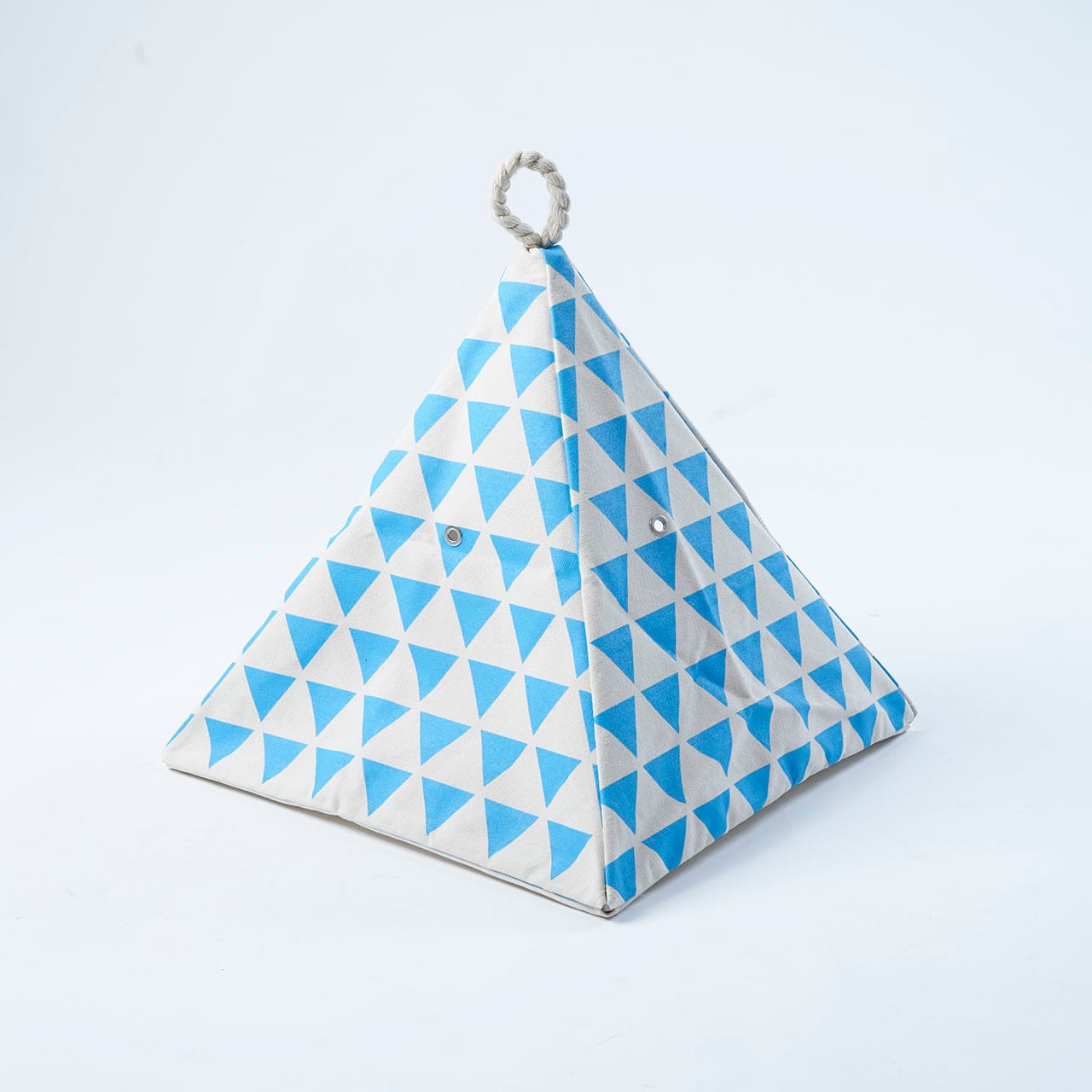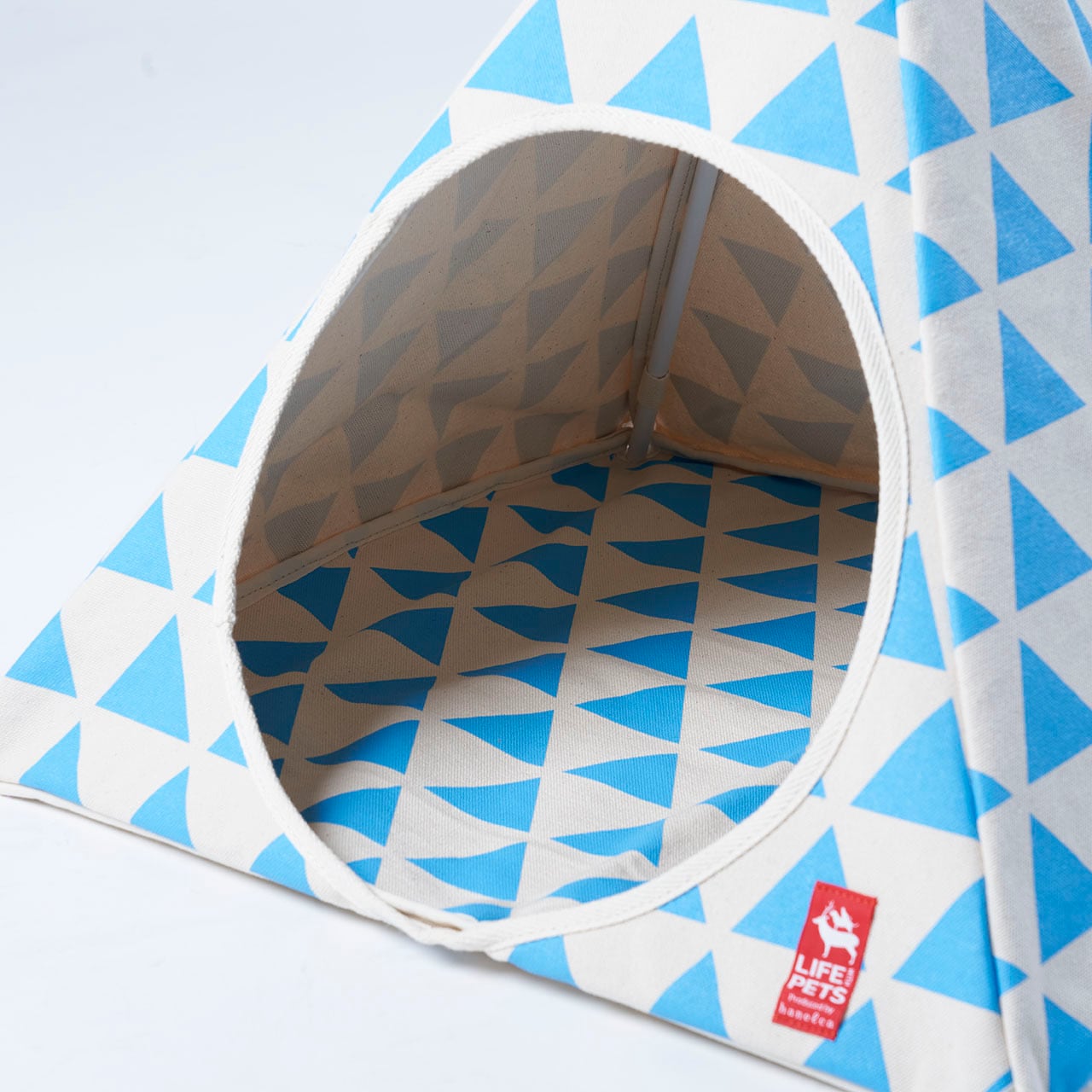倉敷帆布に京都の手捺染で染色をしたオリジナルのテキスタイルで作ったペット用テントです。柄は三角のテントの形に合わせて鱗柄を使用。内部に棒を骨組みとして差し込むことでしっかりと立たせることができます。お部屋の隅に置いてあるだけでインテリアとしてもかわいく、散らかりやすいわんちゃんや猫ちゃんのおもちゃの収納にも使えます。カラーは墨、朱、空、たんぽぽ色の4色から選んでご注文ください。