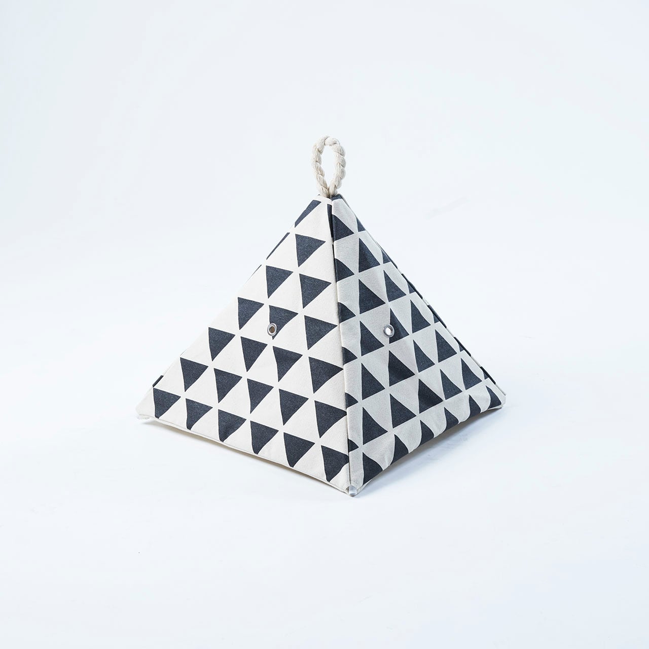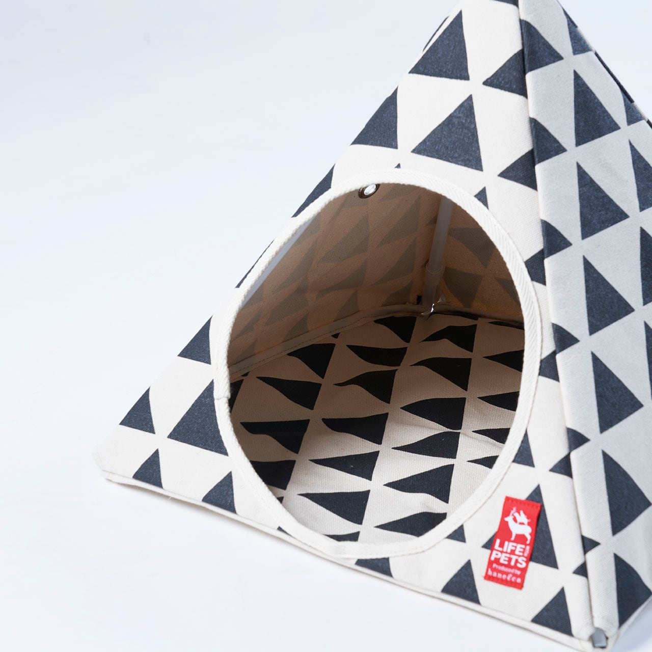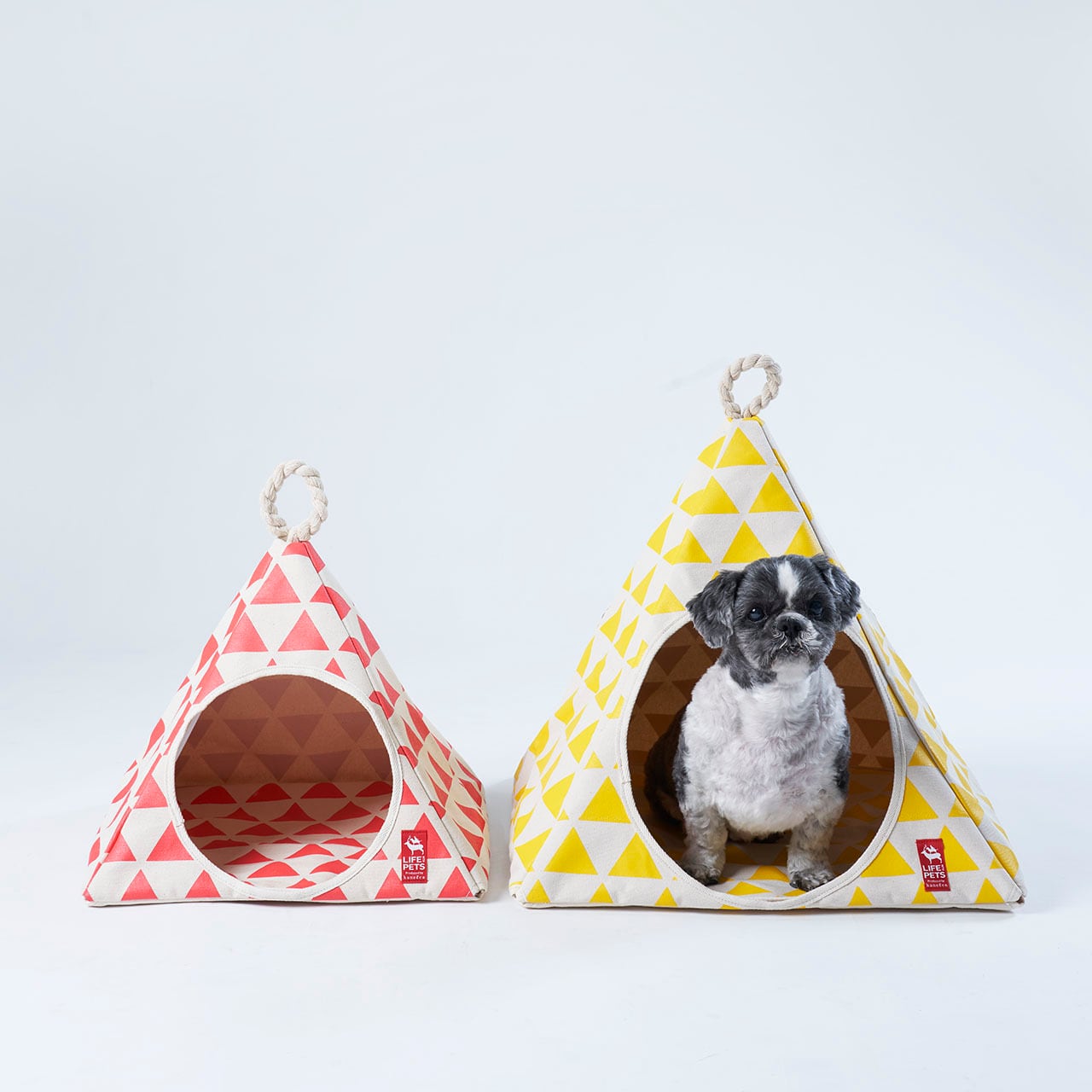 倉敷帆布に京都の手捺染で染色をしたオリジナルのテキスタイルで作ったペット用テントです。柄は三角のテントの形に合わせて鱗柄を使用。内部に棒を骨組みとして差し込むことでしっかりと立たせることができます。お部屋の隅に置いてあるだけでインテリアとしてもかわいく、散らかりやすいわんちゃんや猫ちゃんのおもちゃの収納にも使えます。カラーは墨、朱、空、たんぽぽ色の4色から選んでご注文ください。