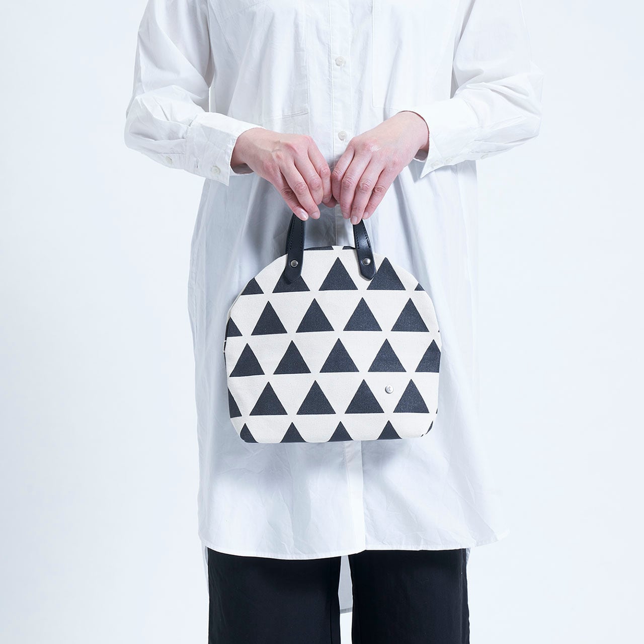 カップケーキのような丸い可愛い形のバッグ。小さく見えるかもしれませんが、実は500mlのペットボトルが横にして入る大きさで長財布もすっきりおさまります。持ち手に本革を使っているのでちょっと良いお店にお食事に行く際のハンドバッグとして。ストラップをつけてアクティブな町歩きにと、いろいろなシーンで活躍してくれること間違いありません。
